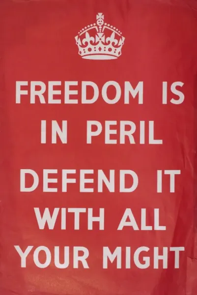 The first two posters were widely distributed throughout the remainder of 1939 and into 1940 during the German invasion of France and the Battle of Britain. Designed by the British Ministry of Information during WWII this Freedom Is In Peril Defend It With All Your Might poster is a variation on the original Keep Calm and Carry On poster used to motivate the public and boost morale. A stylised depiction of a crown.